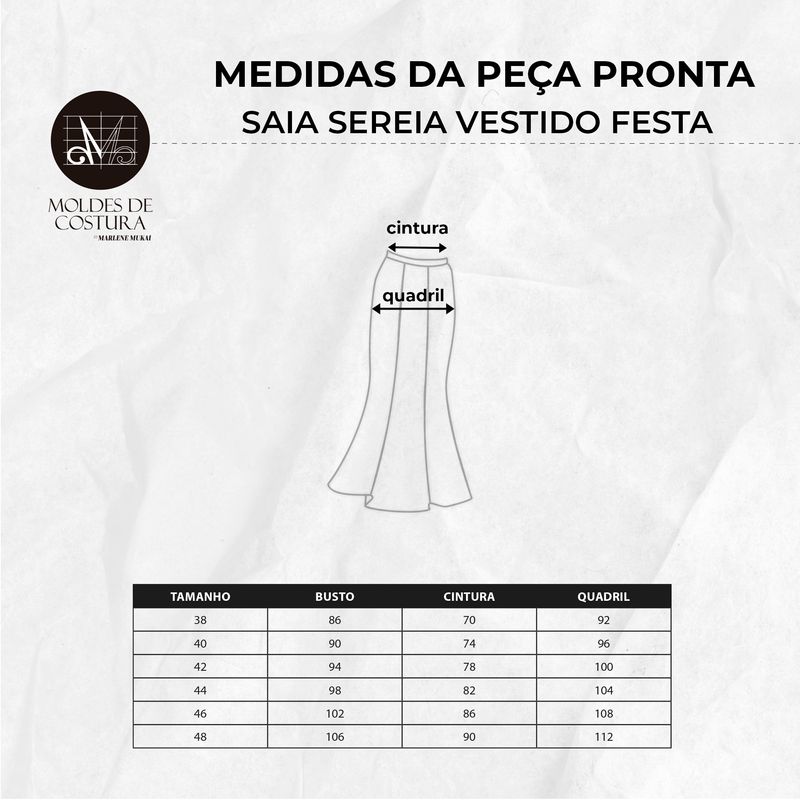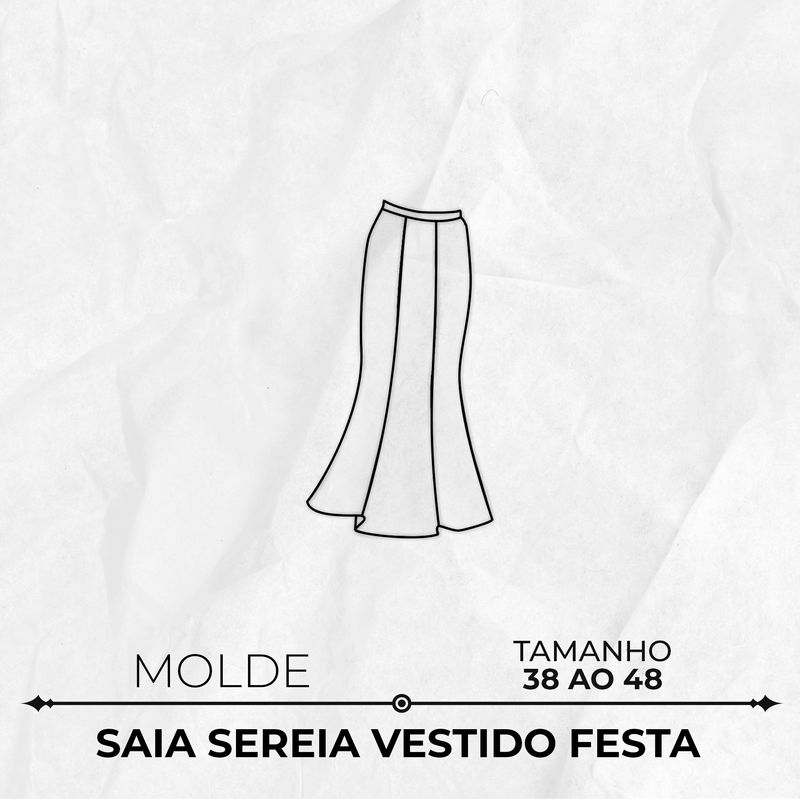 O molde de Saia Sereia para Vestidos de Festa, é graduado do tamanho 38 ao 48, ou seja, comprando um único produto, você recebe 6 tamanhos diferentes de modelagem.