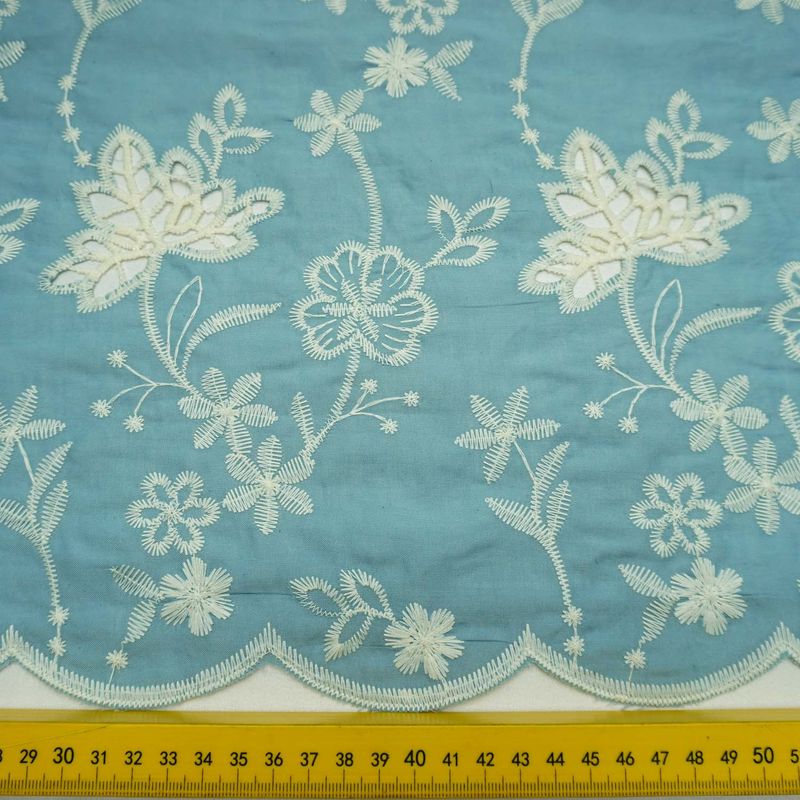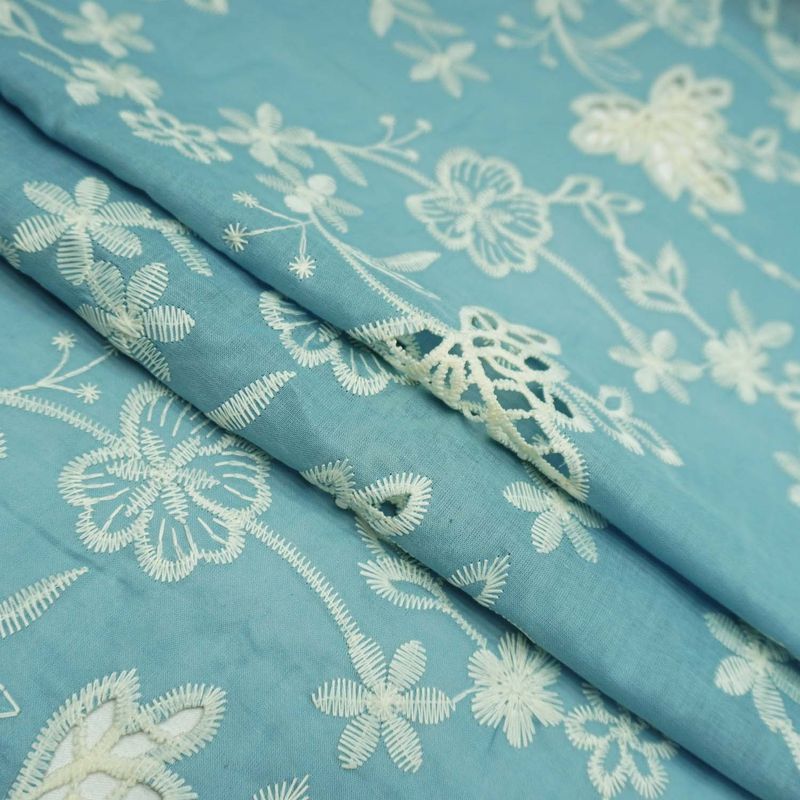 Tecido cambraia de algodao bordado poliester azul serenity/off white
