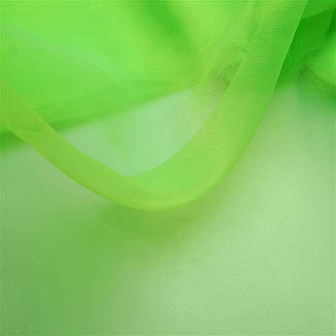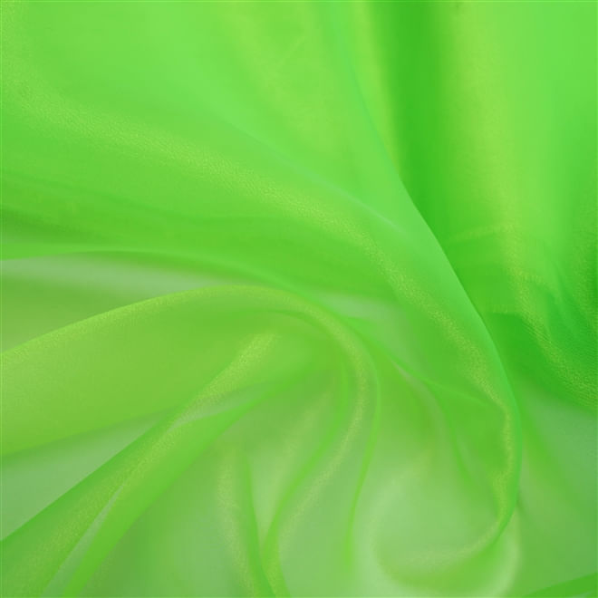 Muito semelhante a versão de seda, a organza cristal é excelente pela sua durabilidade, economia e versatilidade. É um tecido com leve brilho e extremamente armado, muito utilizado para vestidos de festas infantis e debutantes. Esse tom de verde faz parte da moda dopamina e está super em alta!