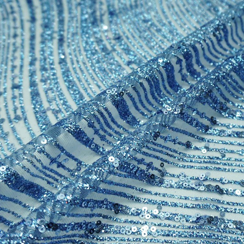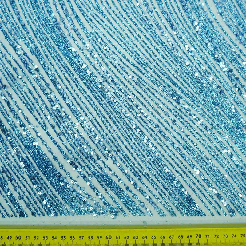 A renda tule com glitter bordado paetê é um tecido muito usado para fazer sobreposição em vestidos de festa para madrinhas, formandas, debutantes e vestidos de noiva. Sua superfície cheia de brilho confere um efeito luxuoso. Também proporciona um volume muito bonito para as saias. É um tecido construído com fios entrelaçados que criam uma rede transparente, mas bastante firme e estável.