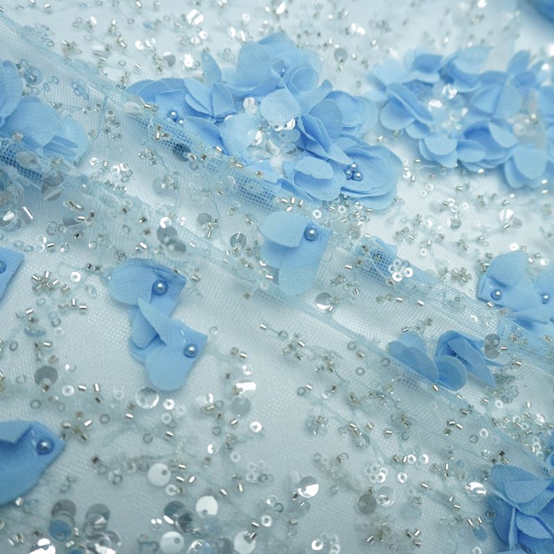 TECIDOSRendas e TulesTule Bordado PaetêTecido tule bordado mini paete floral 3d azul claro