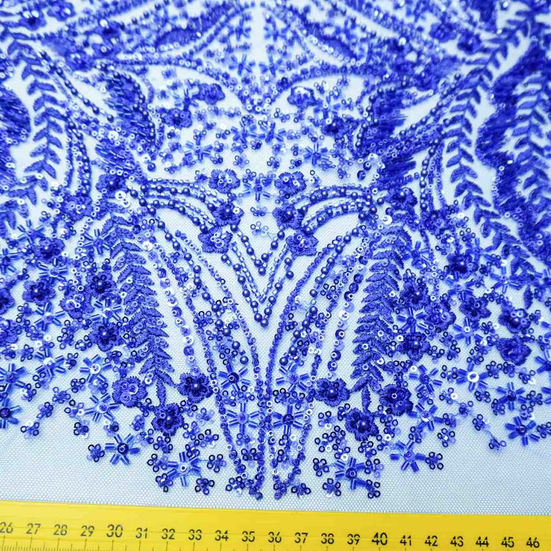 Tecido tule bordado pedraria mini paetê e pérolas azul royal