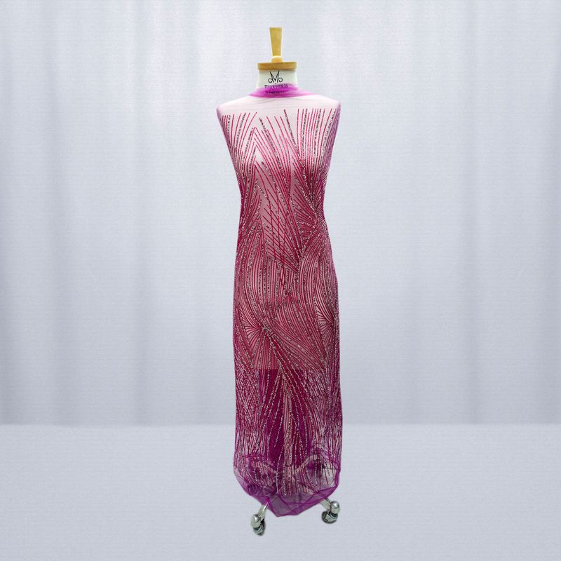 O tule com glitter diamante quebrado fúcsia é um tecido muito usado para fazer sobreposição em vestidos de festa para madrinhas, formandas, debutantes e vestidos de noiva. Sua superfície cheia de brilho confere um efeito luxuoso. Também proporciona um volume muito bonito para as saias. É um tecido construído com fios entrelaçados que criam uma rede transparente, mas bastante firme e estável.